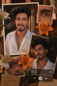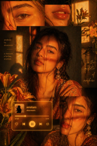 generate a image without changing any facial features cinematic warm-toned collage portrait of a young woman in golden hour lighting, soft shadows falling across her face through a window. She has slightly messy hair strands over her face, glowing skin, subtle makeup with glossy lips, and expressive eyes. She wears traditional ethnic attire with intricate details and dangling earrings. The composition is a multi-frame collage layout with overlapping rectangular crops showing close-ups of eyes, lips, and full face. Color palette dominated by deep amber, orange, and gold tones, with high contrast lighting and moody shadows. Add floral elements (lilies) placed artistically across the collage. Include a minimal music player UI element in warm yellow/orange with a soft glow, giving an aesthetic Instagram reel vibe.put song amsham by aksomanic and that vibe into tha photo Style: dreamy, cinem