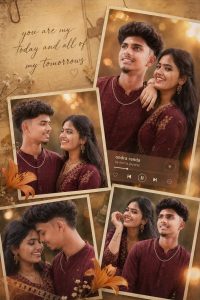 Create a romantic cinematic photo collage using the provided reference image of a real South Asian couple.