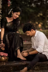 Ultra-realistic cinematic scene of a beautiful South Indian couple in a romantic traditional setting. The man is wearing an elegant Like wearing the original shirt, sitting calmly and focusing gently. The woman is wearing a stunning black saree with subtle shimmer, looking graceful and slightly smiling. She is holding her sandals in one hand, while one of her bare feet is placed softly on the man’s knee. The man is carefully tying a delicate silver anklet (payal/panzeb) around her foot. Soft warm lighting, romantic atmosphere, shallow depth of field, highly detailed textures, natural skin tones, emotional and intimate moment, 8K resolution, cinematic color grading, captured with DSLR (50mm lens, f/1.8) background slightly blurred with soft bokeh lights. 7